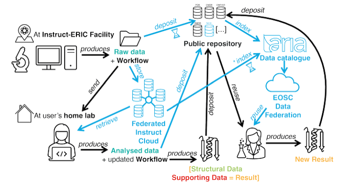 Increasingly, as part of our lead role in the Fragment Screen project, we have been expanding into data management in order to build out the wider Instruct data management plan. The issue always has been that once a researcher conducts their science at one of our facilities, they are often handed their data on a pen drive, at which point we lose oversight. As an organisation we have a commitment to FAIR open science, and so this presents a problem. So, using a tool called FandanGO, which works together with the ARIA platform, we are increasingly capturing experimental metadata, sample information, machine settings etc, together with the raw data location and any outputs (PDB depositions etc), and then associating it with the original scientific proposal. To help our smaller facilities, we are also piloting storage for raw data provision as part of this ecosystem, here FandanGO will talk to ARIA for a number of storage providers in our “federated cloud”.